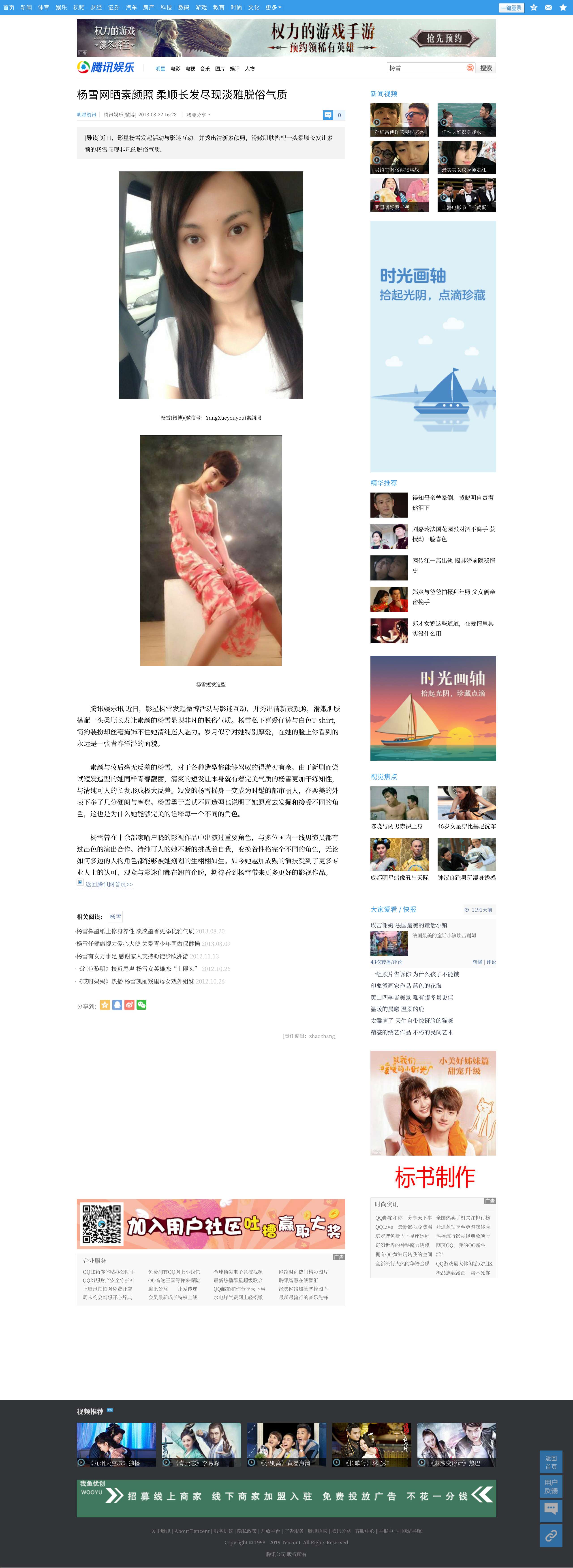 这个有着天使面庞、魔鬼身材的女孩演艺事业蒸蒸日上,但却没有一点儿傲气和世故。在这个充满名利诱惑的演艺圈里,杨雪一直简单地生活着,快乐、美丽、健康就在这种简单中延续。(环球在线评)